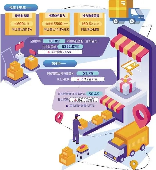 數(shù)據(jù)顯示,上半年,全國(guó)社會(huì)物流總額160.6萬(wàn)億元,按可比價(jià)格計(jì)算,同比增長(zhǎng)4.8%,比1月份至5月份提高0.3個(gè)百分點(diǎn),二季度環(huán)比提高1.6個(gè)百分點(diǎn),年內(nèi)物流需求累計(jì)增長(zhǎng)整體呈回升態(tài)勢(shì)。6月份,中國(guó)物流業(yè)景氣指數(shù)為51.7%,較上月回升0.2個(gè)百分點(diǎn),中國(guó)快遞發(fā)展指數(shù)為366.3,同比提升26.6%。