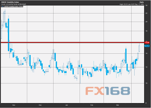 根據(jù)FactSet數(shù)據(jù),周二CBOE波動性指數(shù)升至15.88,創(chuàng)下去年11月11日以來最高水平。該指數(shù)在去年11月4日曾飆升至23.01。