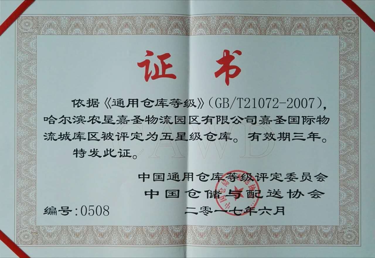 2017年6月,嘉圣國(guó)際物流城喜獲“中國(guó)五星級(jí)倉(cāng)庫(kù)”稱(chēng)號(hào)。根據(jù)《通用倉(cāng)庫(kù)等級(jí)》(GB/T21072-2007),哈爾濱農(nóng)墾嘉圣物流園區(qū)有限公司被評(píng)定為五星級(jí)倉(cāng)庫(kù)。此項(xiàng)殊榮是嘉圣園區(qū)繼2014年首次獲得后的第二次,截止到目前黑龍江省獲得五星級(jí)的企業(yè)僅有兩家。
