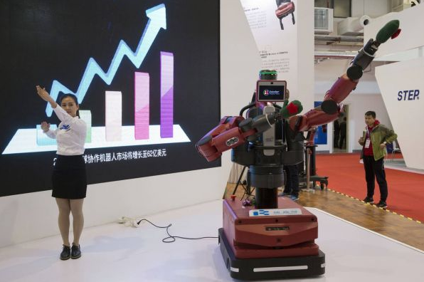 圖為去年10月在北京舉行的世界機器人大會上,工作人員在展示工業(yè)機器人的性能。(美聯(lián)社資料圖片)