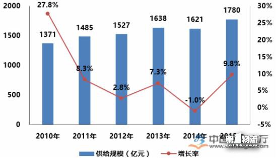 2010-2015年間中國(guó)商用冷鏈?zhǔn)袌?chǎng)規(guī)模整體處于上升態(tài)勢(shì),供給規(guī)模從2010年的1371億元增長(zhǎng)至2015年的1780億元;但是,2010-2015年期間,中國(guó)商用冷鏈供給規(guī)模增長(zhǎng)率波動(dòng)較大,其中2014年的供給規(guī)模下降1.0%,商用冷鏈供給規(guī)模的下降主要是由商用冷柜等相關(guān)產(chǎn)品供給規(guī)模下跌導(dǎo)致。
