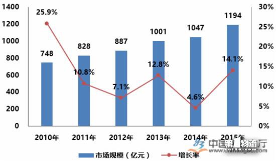 受到零售、食品、冷鏈物流行業(yè)等發(fā)展影響,2010-2015年,中國(guó)商用冷鏈?zhǔn)袌?chǎng)保持著不斷增長(zhǎng)的態(tài)勢(shì),但是受到宏觀經(jīng)濟(jì)和市場(chǎng)需求波動(dòng)等不穩(wěn)定因素的影響,增長(zhǎng)率有較大幅度的波動(dòng)。
