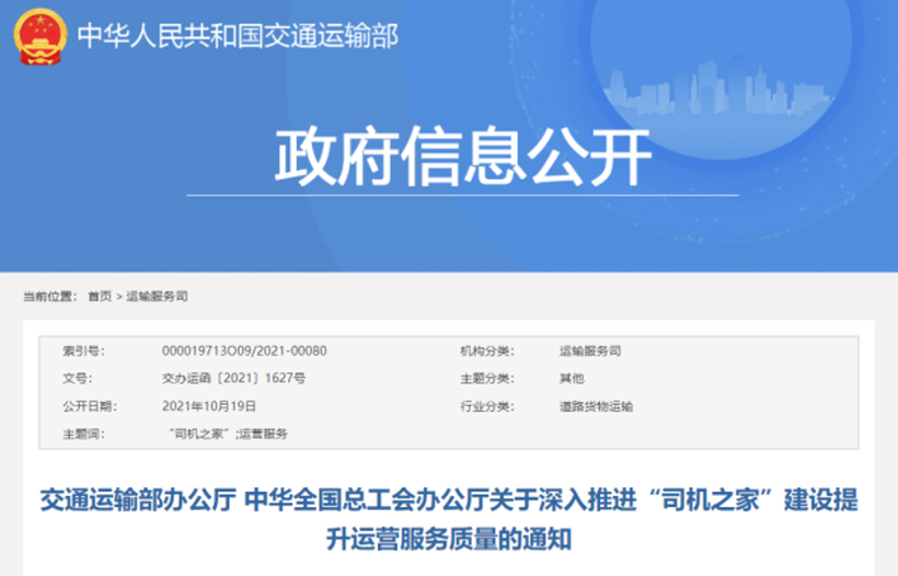 10月19日,交通運(yùn)輸部網(wǎng)站發(fā)布《交通運(yùn)輸部辦公廳 中華全國總工會(huì)辦公廳關(guān)于深入推進(jìn)“司機(jī)之家”建設(shè)提升運(yùn)營服務(wù)質(zhì)量的通知》,要求各級交通運(yùn)輸主管部門、工會(huì)組織因地制宜開展“司機(jī)之家”建設(shè)運(yùn)營,推出讓貨車司機(jī)愿意用、用得起的餐飲、停車、休息、洗浴、洗衣等服務(wù),加強(qiáng)對已投入運(yùn)營“司機(jī)之家”服務(wù)質(zhì)量的跟蹤監(jiān)測,切實(shí)改善廣大貨車司機(jī)停車休息環(huán)境和條件。